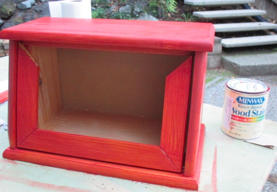 Thinking I could surely find a way to fix it without unhinging the rest of the front piece, I went ahead and sanded the roombox with the Mouse sander, then applied two coats of Minwax tinted stain. This is a water based stain I’ve had sitting around for a while, I think the color name is “Spice”. It’s not quite as bright red as in the picture.