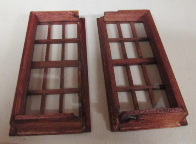 The corner window on the front was a challenge. (This is the part I’d been putting off for such a long time and knew I’d never be able to figure out again if I just packed away the pieces without finishing it…) To fit into the bump out at the front of the house, I needed two windows to meet at a right angle. I had to shave down one side of each window and cut into the top and bottom pieces, so they’d fit snugly.