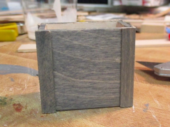 I stained the cabinet, corner trim, and some pieces I planned to use for cabinet doors and a drawer. The stain is Minwax Classic Gray.