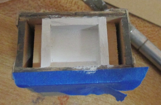 Because I’m bad about cleaning up after a project, the ends of the 1:12 shutters I cut up to make louvered doors were still sitting on the table. They had nice straight edges and the back sides looked appropriately door-like, but they were way too thick. I scrounged up some more scraps to camouflage the thickness and came up with this.