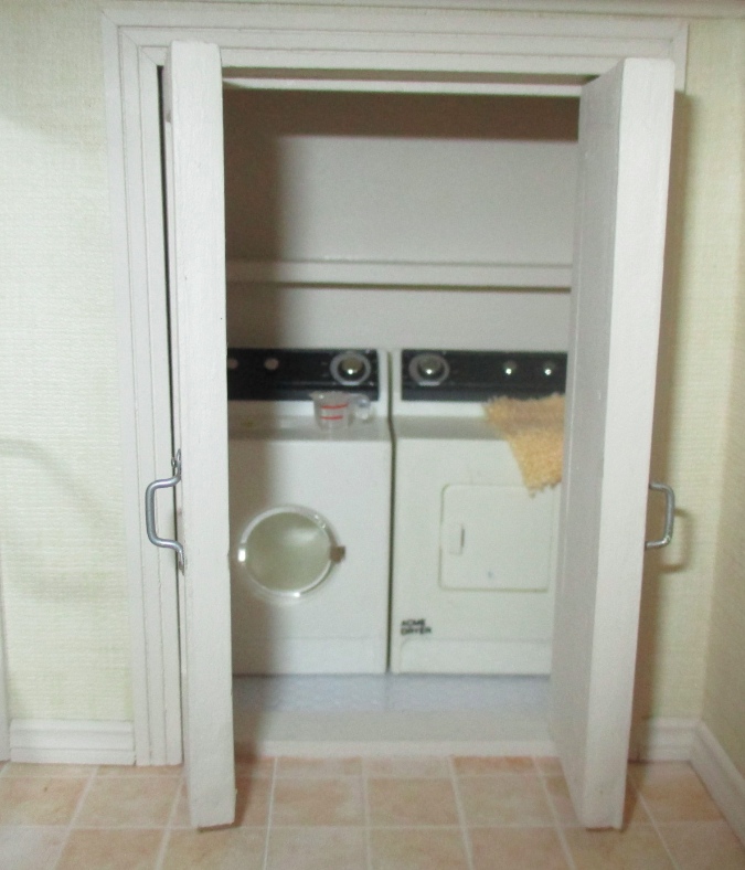 Ta da! Now I just need to get some detergent. The generic Laundry Detergent box in the earlier photos was attached to the washing machine, until the washer fell on the floor and it broke off. I can still use it but I’d like something more realistic. (What I’d really like is a plastic bottle of detergent, as opposed to a cardboard box, but so far I haven’t been able to find any in half scale.)
